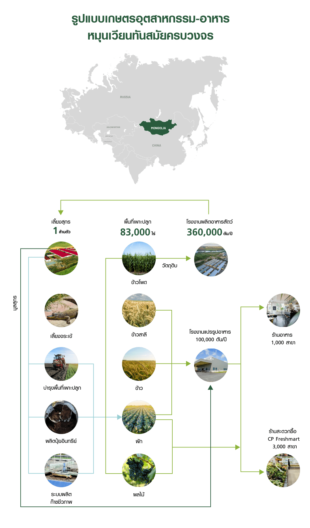เนื่องด้วยสาธารณรัฐประชาชนจีนได้มีนโยบายที่จะยกระดับความเป็นอยู่ของประชาชนในพื้นที่ห่างไกลด้วยวิธีการสนับสนุนการเกษตรและปศุสัตว์ให้มีความยั่งยืน ผนวกกับในปัจจุบัน พื้นที่ฟาร์มสุกรเริ่มมีการย้ายขึ้นไปทางเหนือสู่เขตมองโกเลียใน (Inner Mongolia) ซึ่งอยู่ภายใต้การปกครองของประเทศจีน นอกจากนี้ กระทรวงการเกษตรของประเทศจีนยังมีนโยบายสนับสนุนการใช้ปุ๋ยอินทรีย์ในการเพาะปลูกผลิตผลทางการเกษตร และมีการเก็บภาษีสำหรับการปศุสัตว์แบบดั้งเดิมมากขึ้น ทางเครือเจริญโภคภัณฑ์จึงได้เริ่มโครงการโรงงานผลิตเนื้อสุการแปรรูปในเขตมองโกเลียใน โดยตั้งเป้าในการผลิตเนื้อสุกรที่ 1 ล้านตัวต่อปี ในช่วงทดลองระหว่างปี 2559–2553 เพื่อตอบสนองนโยบายรัฐบาลจีน